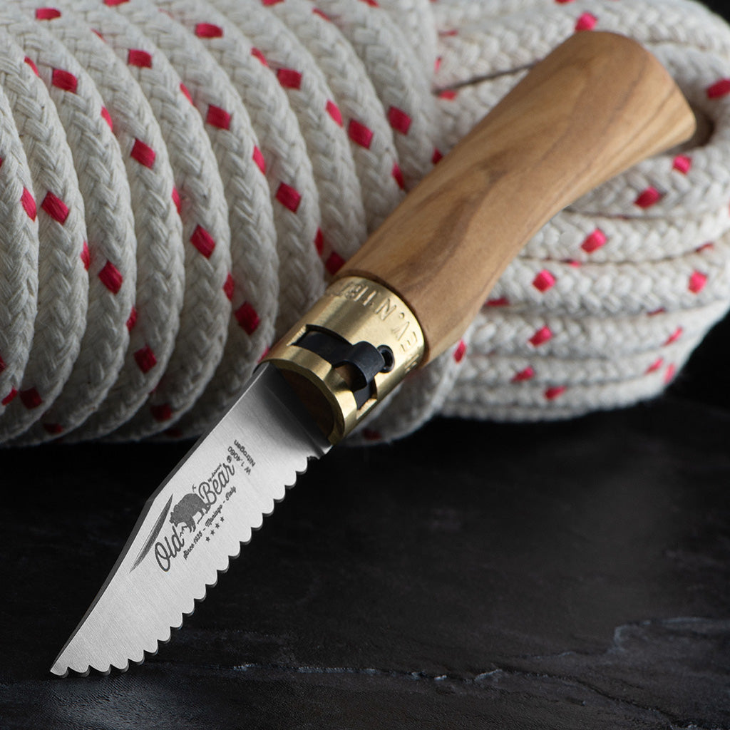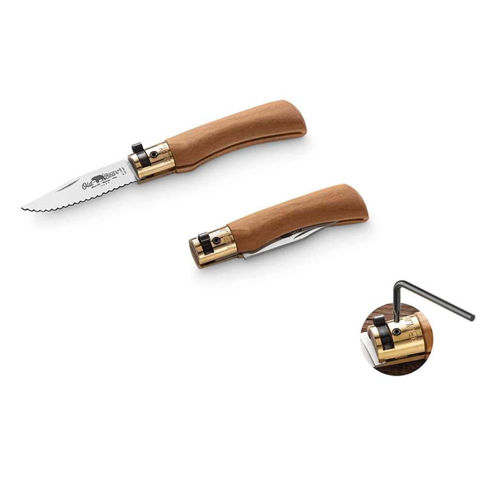 For those who want serrated cutting capability wrapped in distinctive Italian olive wood, this version combines functionality with character. The hand-finished blade handles rope, webbing, and tough synthetic materials with ease, while the olive wood handle brings warmth and unique grain patterns that make each knife genuinely one-off. Antonini's craftsmen in Maniago select the olive wood for grain and stability, finish it with food-safe treatments, and pair it with a nitrogen steel blade that's individually sharpened. The serrations are properly formed rather than stamped, which matters when you're cutting through tough materials under load. The patented Lupo collar lock secures the blade in both open and closed positions without relying on springs. The nitrogen content in the steel means better corrosion resistance than standard stainless, useful around water or wet rope. Each knife is unique thanks to natural variations in the olive wood grain. Opens with a traditional nail nick, and the collar tension adjusts with the included Torx key.