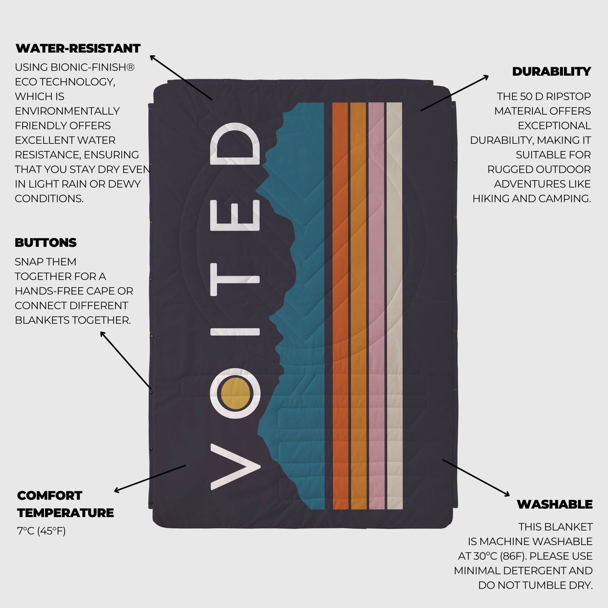 Ethically Sourced Materials - Made from 100% Recycled REPREVE® fabric. Voited strive to use the most environmentally friendly fabrics possible their manufacturing process. For their outdoor blankets, they have replaced nylon made from oil based plastic chips with REPREVE®, the leading performance fibre made from recycled materials (including plastic bottles).