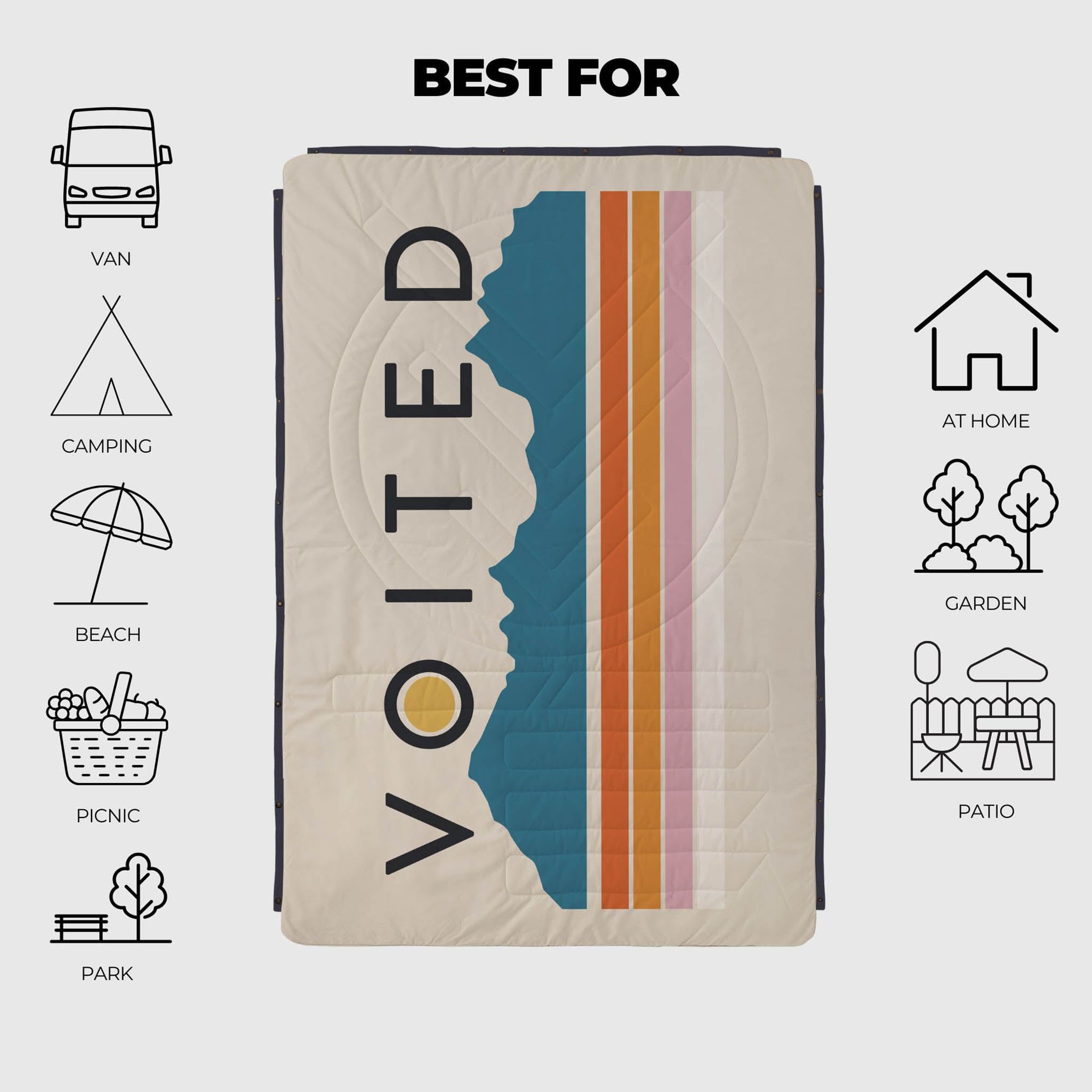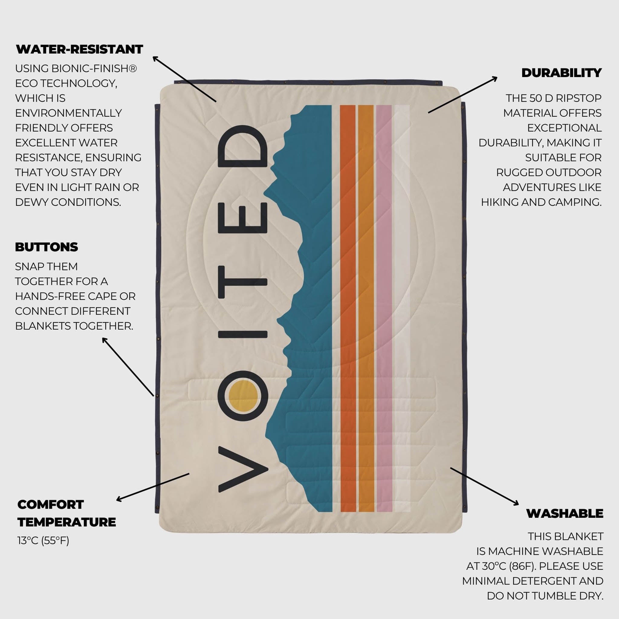 • Ethically Sourced Materials - Made from 100% Recycled REPREVE® fabric. Voited strive to use the most environmentally friendly fabrics possible their manufacturing process. For their outdoor blankets, they have replaced nylon made from oil based plastic chips with REPREVE®, the leading performance fibre made from recycled materials (including plastic bottles).