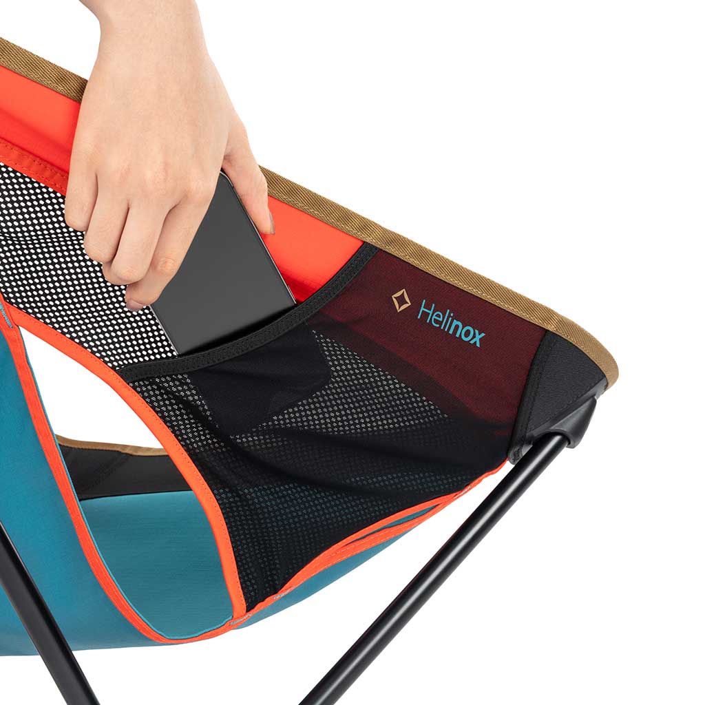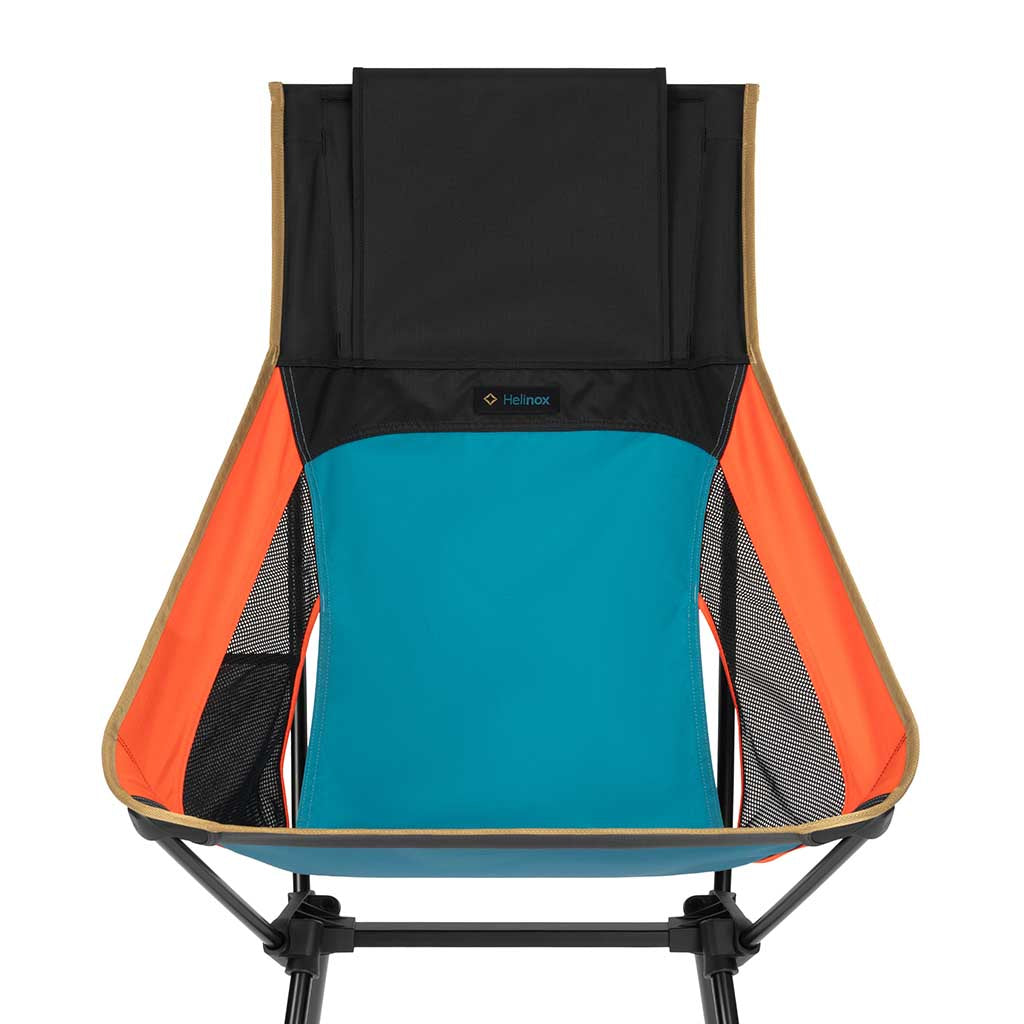 Camp like you mean it. The Sunset Chair (re) evolves a Helinox classic with (re)Tension Design — an extra tension line that redistributes load for a deeper, more supportive sit. Longer legs make getting in and out effortless, while the tall back cradles shoulders and neck when you’re lingering by the fire. Assembly is a breeze thanks to molded corner pockets and shock-corded poles, and the redesigned hubs pair with DAC alloy for trusted stability. Thoughtful touches seal the deal: an integrated side pocket for bits and bobs, a headrest flap that holds a puffy or the case for cushy support, and hard-wearing, bluesign®-approved recycled fabrics with breathable mesh. All while packing down neatly for weekends away, festival fields or glamping hideaways.